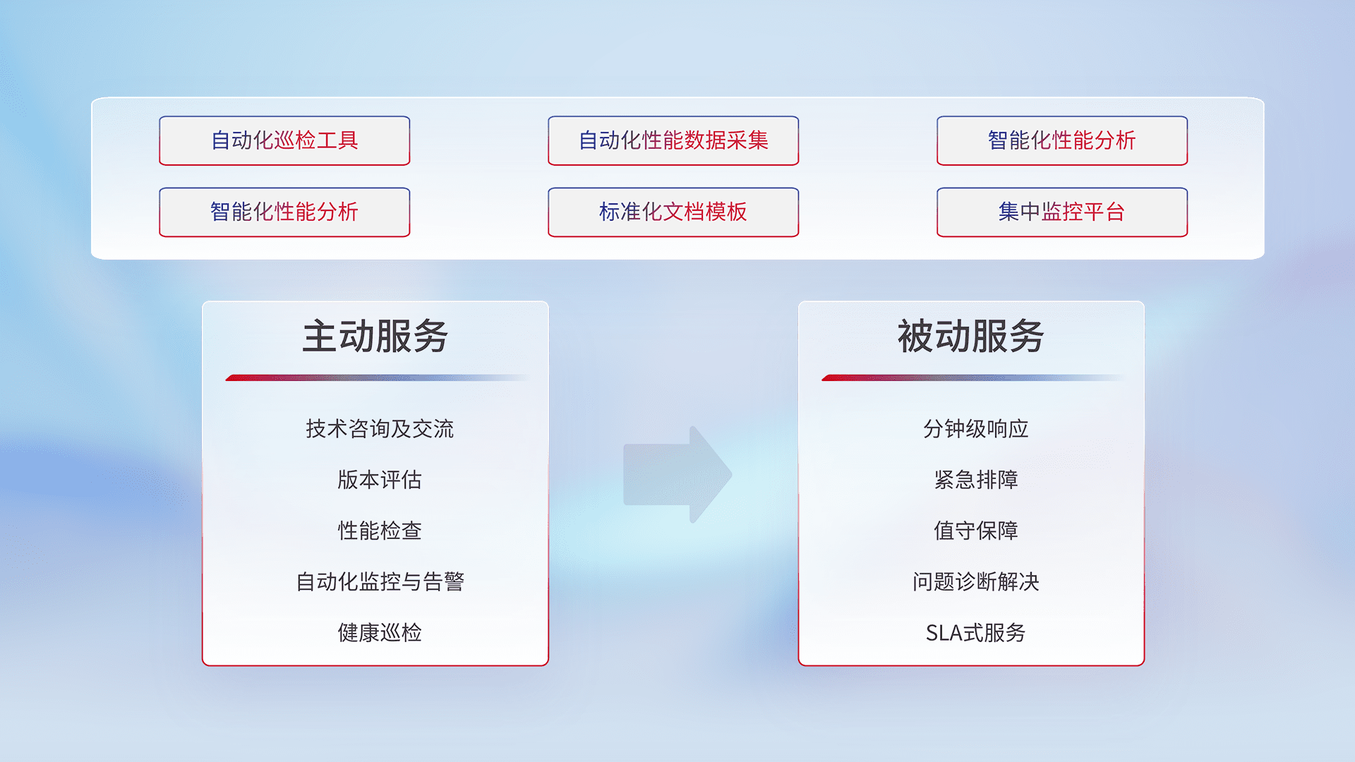 智能化工具和标准化文档,,保障服务质量,,,,提供主动服务(包含技术咨询、、、、版本评估、、、性能检查、、、、自动化监控与告警、、、健康巡检)和被动服务包含(分钟级响应、、、、紧急排障、、值守保障、、、、问题诊断解决、、、SLA服务)。。。。